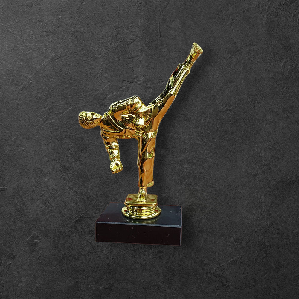 Stylish high-kick pose trophy with a solid marble base and name plate. Perfect for tournaments, belt tests, or student awards — elegant, durable, and customizable.